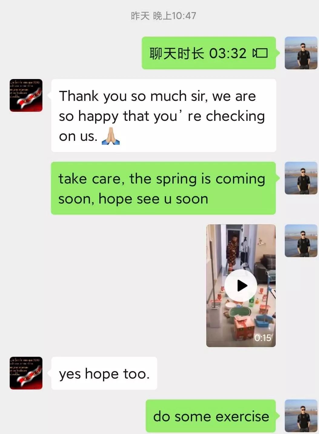 老师对留学生们深切的关爱。看到夜以继日奋战的医务人员、不辞辛劳的各战线工作者、和送温暖的老师们,留学生们都对中国和中国人民战胜疫情充满信心。他们一起为中国祈祷,加油中国,我们和你在一起!