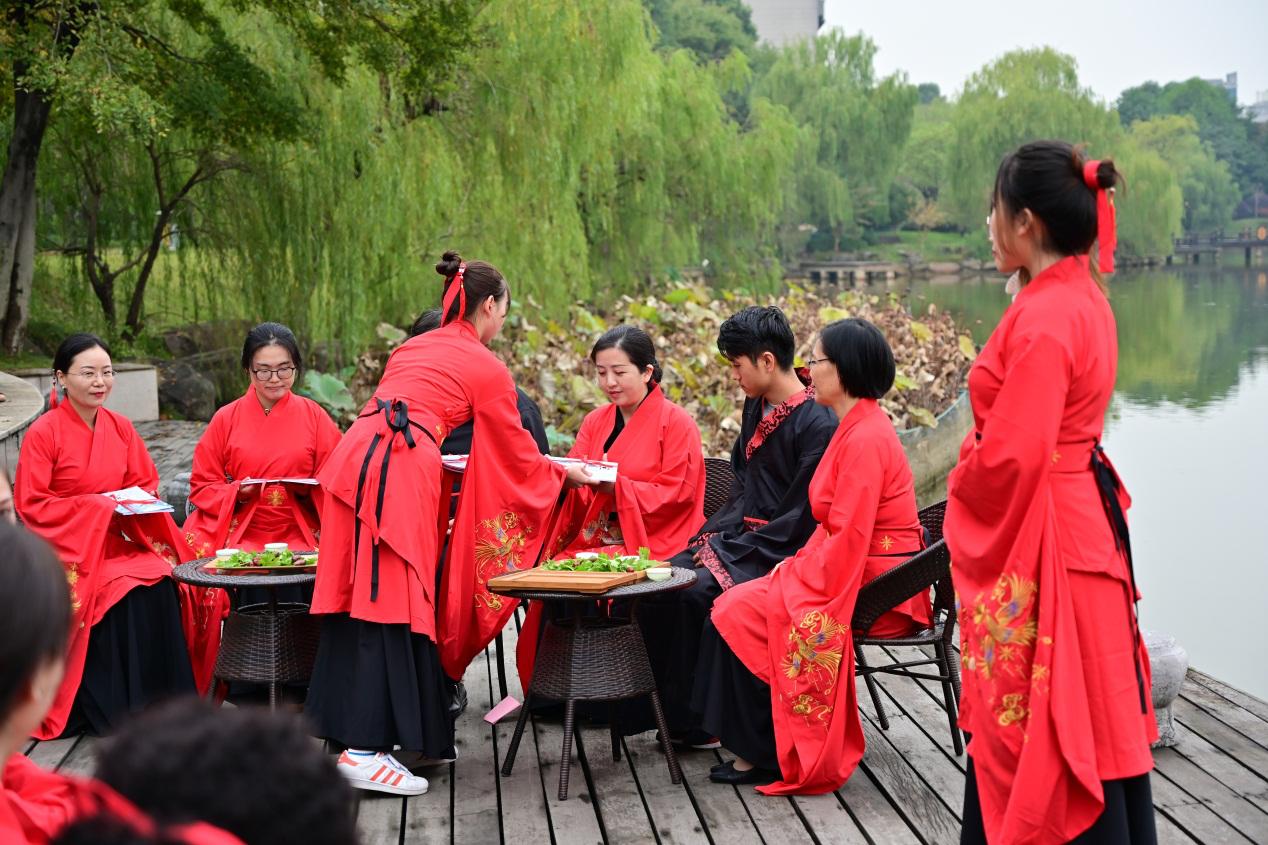 在人文与传播学院高燕书记致辞之后,活动进入第一个环节:太学入学礼。该环节分为五项,分别是释菜礼、敬茶礼、老师回礼、诗歌吟唱和击鼓明志。