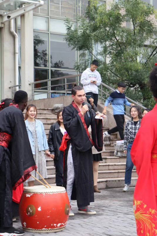 进入诗歌吟唱环节,一首由留学生与人文与传播学院朗读团共同朗诵的《诗经·木瓜》,把人的思绪带入了中华传统文化无垠的长河里。百转千回、意蕴深远。在击鼓明志环节中,一声声清脆有力的鼓响寄托了老师们对学子们殷切的期盼,也饱含着学子们励志向学奋发前行的学习热情。