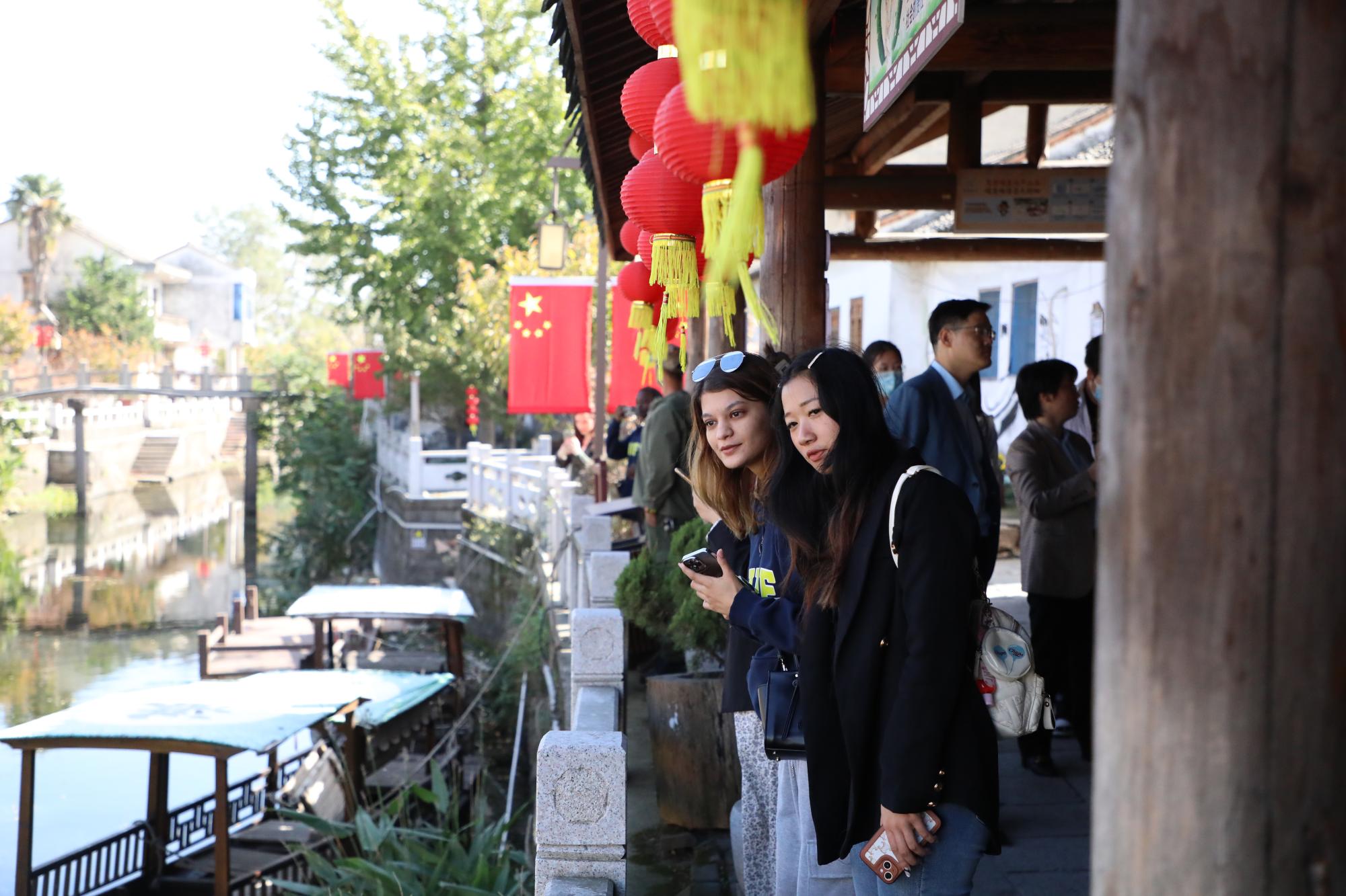 “这里和城市不太一样,非常安静,我喜欢这样闲适恬静的生活。”来自赞比亚的留学生NYAMBE TASHA NATASHA在参观港廊古村落时说到。港廊古村是浙北地区最长的古村落,两岸廊檐建筑蜿蜒约两公里,白墙灰瓦、流水涓涓。学生们漫步在村落里,在小桥流水间感受悠悠古韵。