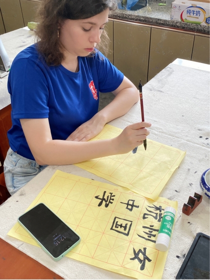 7月2日,在当地学校老师的带领下,留学生们来到了淳安县梓桐镇中心学校,在这里他们上了一堂别开生面的书法课。学习了一年书法的Arina写的字受到了学校老师们的好评,纷纷表示没想到留学生也能把书法写的这么好。Arina邀请书法老师姜老师在宣纸上一同写下“中国·梓桐”的字样。Arina说:“我对书法真的很感兴趣,我们学校的书法老师教得很好。我也会继续学习书法,写更多更好的汉字给我的朋友们。”