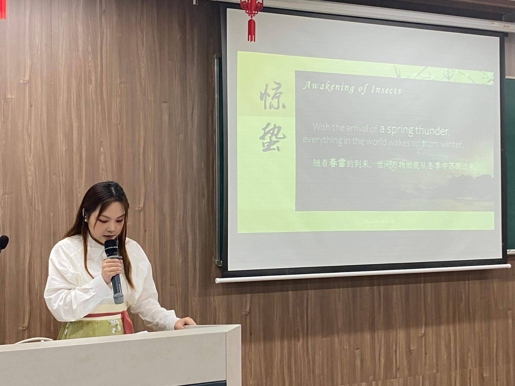 中国二十四节气讲座由来自人文与传播学院汉语国际教育专业的三位研究生主讲,她们详细讲解了立夏、惊蛰、冬至等节气,从风味饮食、传统民俗、趣味故事等方面由浅入深体现中华文化之美。留学生们听得津津有味、如痴如醉,中华传统文化在不经意间浸润心田。