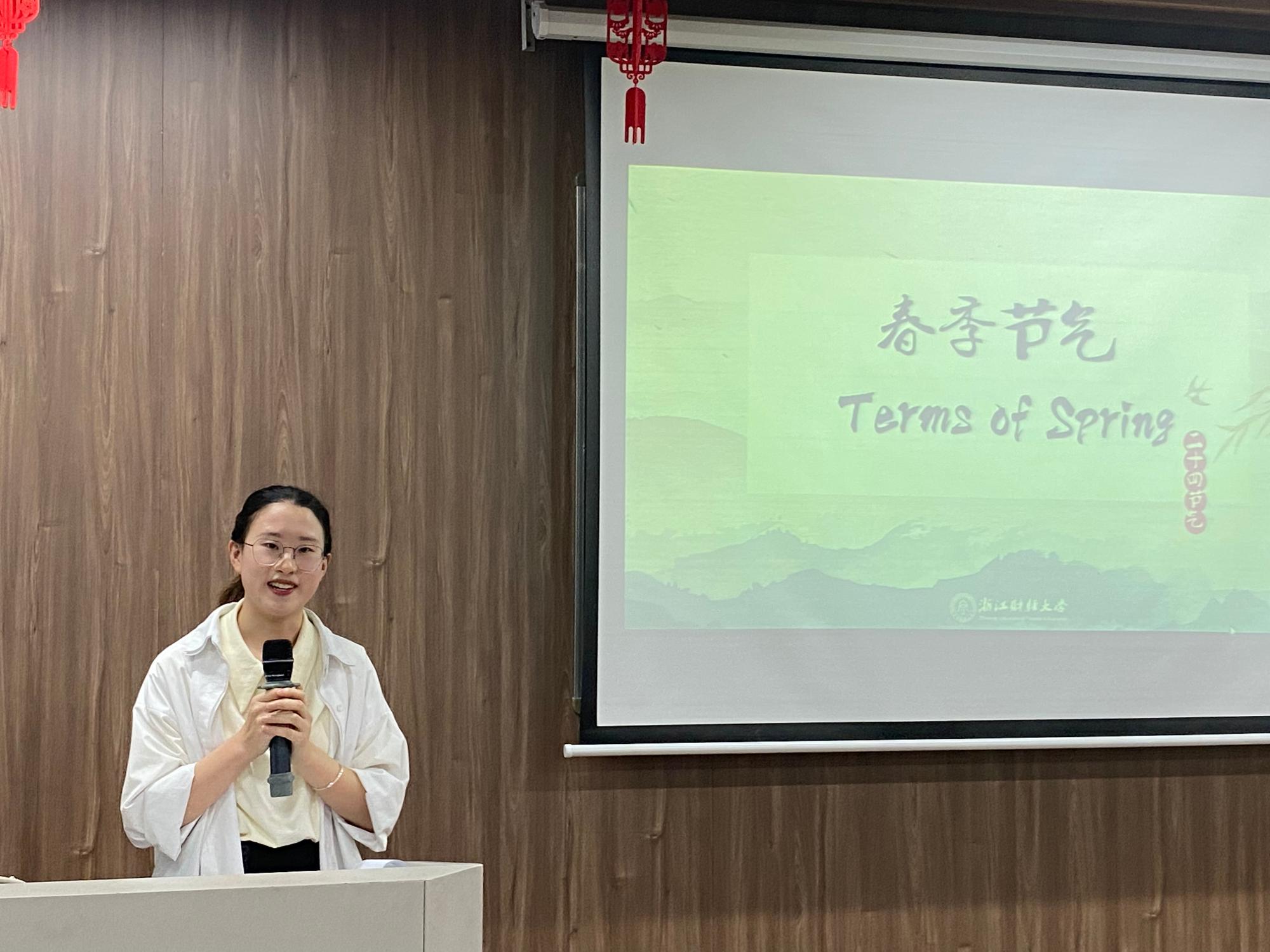 活动伊始,留学生辅导员陈思涵首先阐明今天是二十四节气中的立夏,给留学生们讲述了立夏节气的传统习俗,并简要地介绍了今天的活动流程。