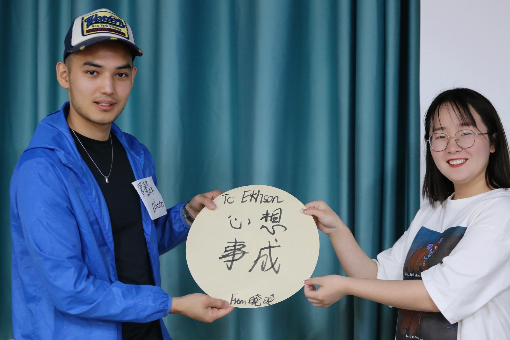 文华书院的文化导师,外国语学院大学外语部主任张迅副教授分享自己的青年时期的经历,并对青年学子们提出了期望:应对挑战抓住机遇,并邀请同学们拿起毛笔,将对相互的青春励志的话语写在宣纸上,并赠予对方。
