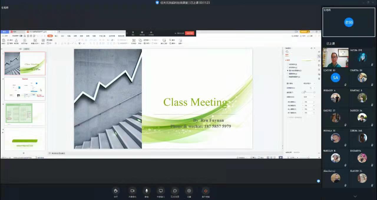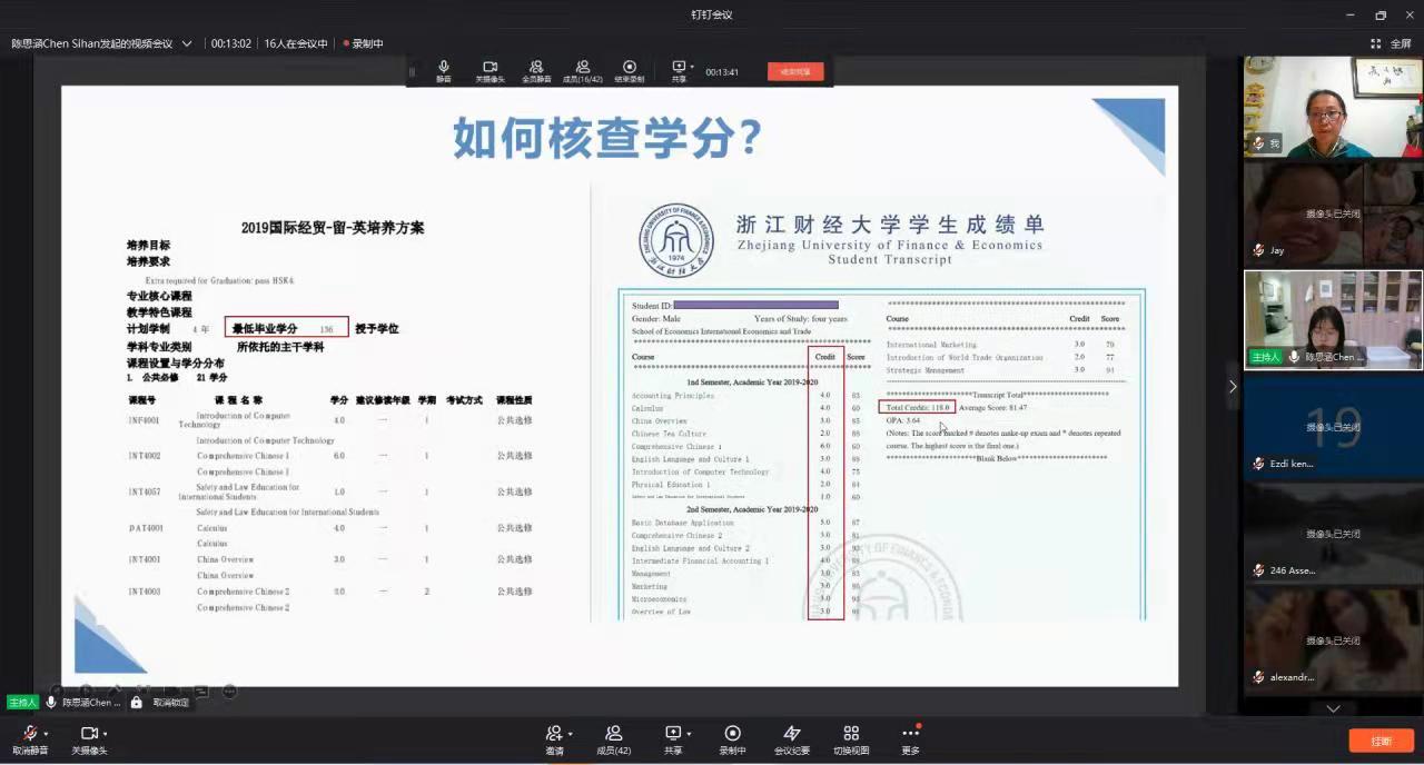 的各项规章制度。接着介绍了与新生相关的各个部门和负责老师。此外,还在线演示指导留学生正确使用教务系统,并对学生活动等各项事宜进行了介绍。班会结束后,留学生们就不太清楚的事宜进行询问,辅导员们都耐心的进行了解答。
