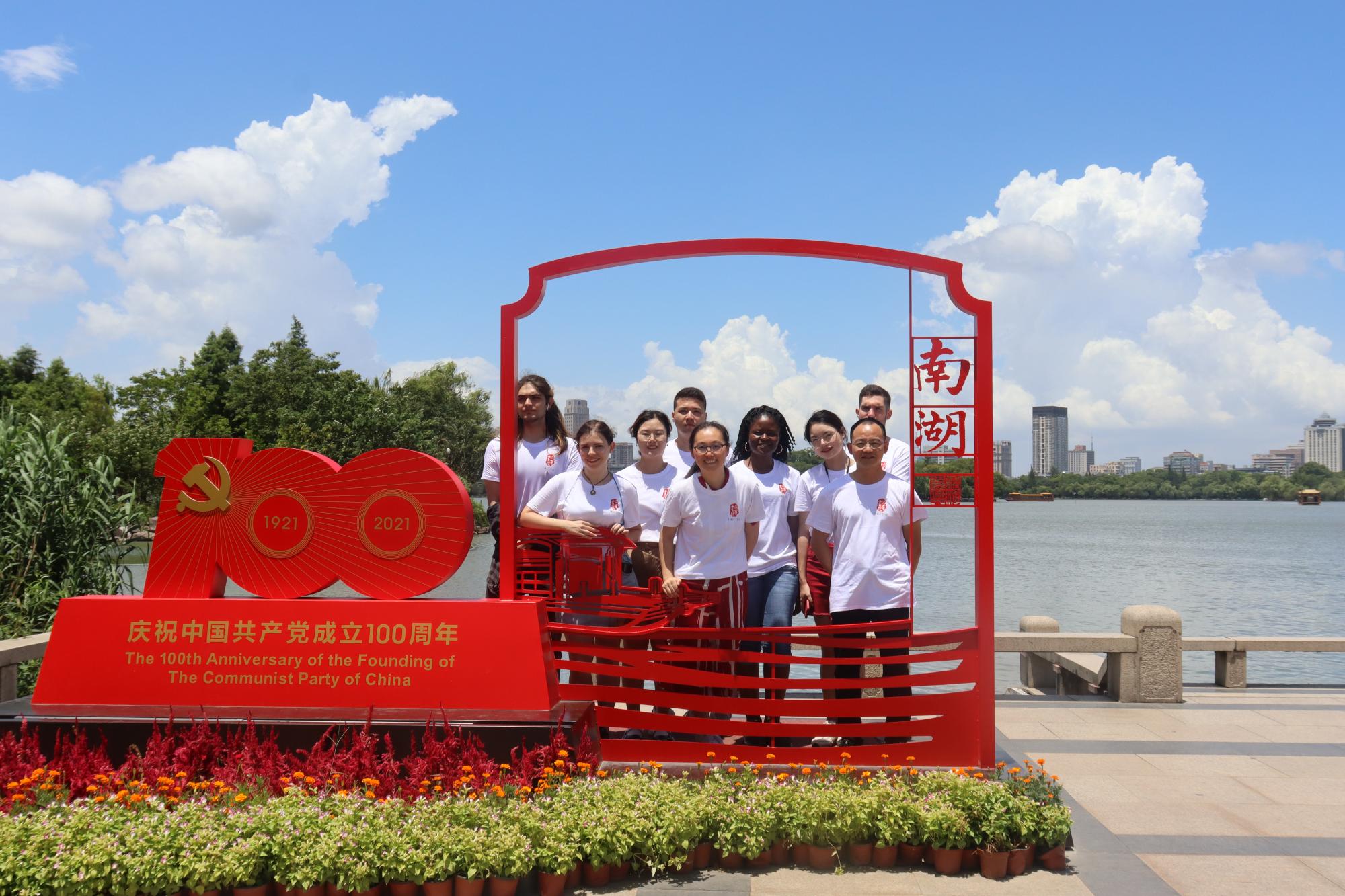 的留学生和老师们来到嘉兴南湖,参观南湖红船,追溯红色记忆。