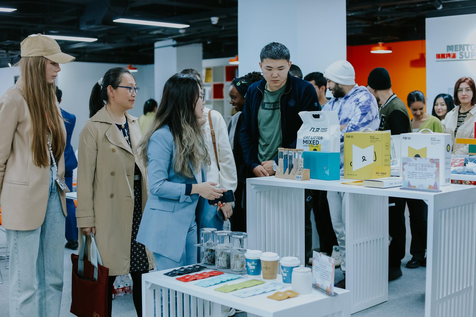 在相关负责人的带领下,国际学生实地参观了网尚空间,在网尚空间一楼大厅,陈列着诸多标识有企业名称和二维码的产品,都是在网尚空间孵化成功的项目。负责人提到,杭州市的创业陪跑空间为创业者提供理念陪跑、社群陪跑、领教陪跑、课程陪跑、空间陪跑、数字陪跑“六位一体”的创业陪跑服务,全方位助力初创企业。