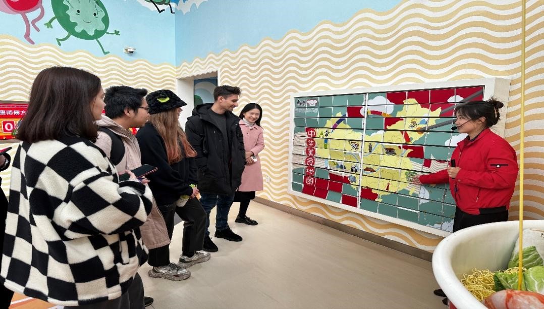 跟随着讲解人员的脚步,留学生们首先来到红烧牛肉面的立体模型前,巨大的碗里放着牛肉、青菜、虾、鸡蛋等食材模型,大碗的上方有一个叉子,叉子上挂着金黄色的面条。旁边是一幅由各种食材填充的中国地图,不同食材代表我国不同地域的口味偏好,也代表着康师傅因地制宜所推出的各种特色口味,红烧排骨、鲜虾鱼板、老坛酸菜等等,口味之多让留学生们连连称奇。