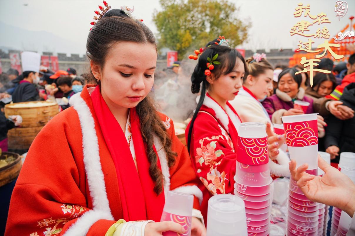 本次活动分为严州古城参观及中国民俗体验两部分进行。1月18日适逢中国传统节日——腊八节,留学生们跟随向导脚步,参观了美丽的古城。随后,“鱼跃龙门起大锅”“严州宋韵赶大集”“卧虎藏龙开大营”等诸多特色民俗活动轮番登场,让留学生们体验了一场大型非遗民俗盛宴。在古城瓮城里,五口大锅升腾起年味的热气,大家一起动手烹饪蒸煮,并为现场市民送上暖心的腊八粥。龙山书院广场上的宋韵集市也热闹非凡,写春联,打年糕,剪窗花……留学生们当起了“非遗传承人”,近距离感受浙西特色非遗与建德人特有的“宋韵浪漫”。市集还专门开辟了国际特色产品区,留学生们学做摊主,纷纷为各自家乡的特产吆喝叫卖。