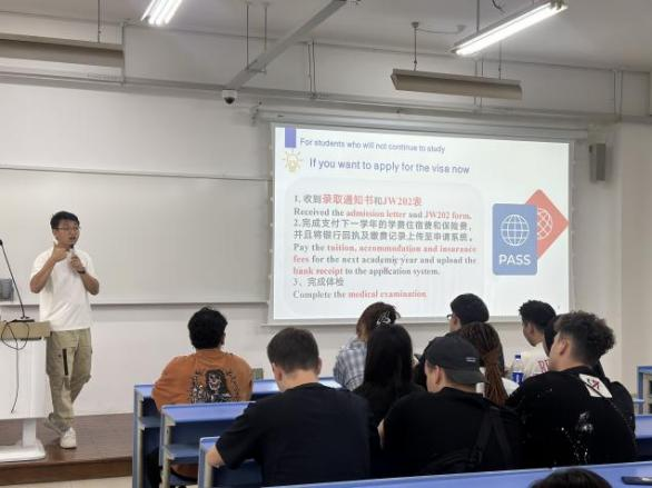 语言生专场会议上,辅导员徐哲艺对于继续留校就读的学生,提醒其关注新学期安排、注册时间以及签证申请等;对即将结业离校的学生,则详细说明了离校手续办理和宿舍退宿流程;学历生会议上,辅导员汪博林从暑假安排、奖学金申请、假期出行报备、毕结业相关流程、暑假安全注意事项等多方面展开讲解,通过分享本学年以来国际学生发生的安全事故案例,提醒国际学生在华期间要严格遵守中国法律法规和校纪校规,避免签证逾期、非法就业、酒后滋事等违法违纪行为。