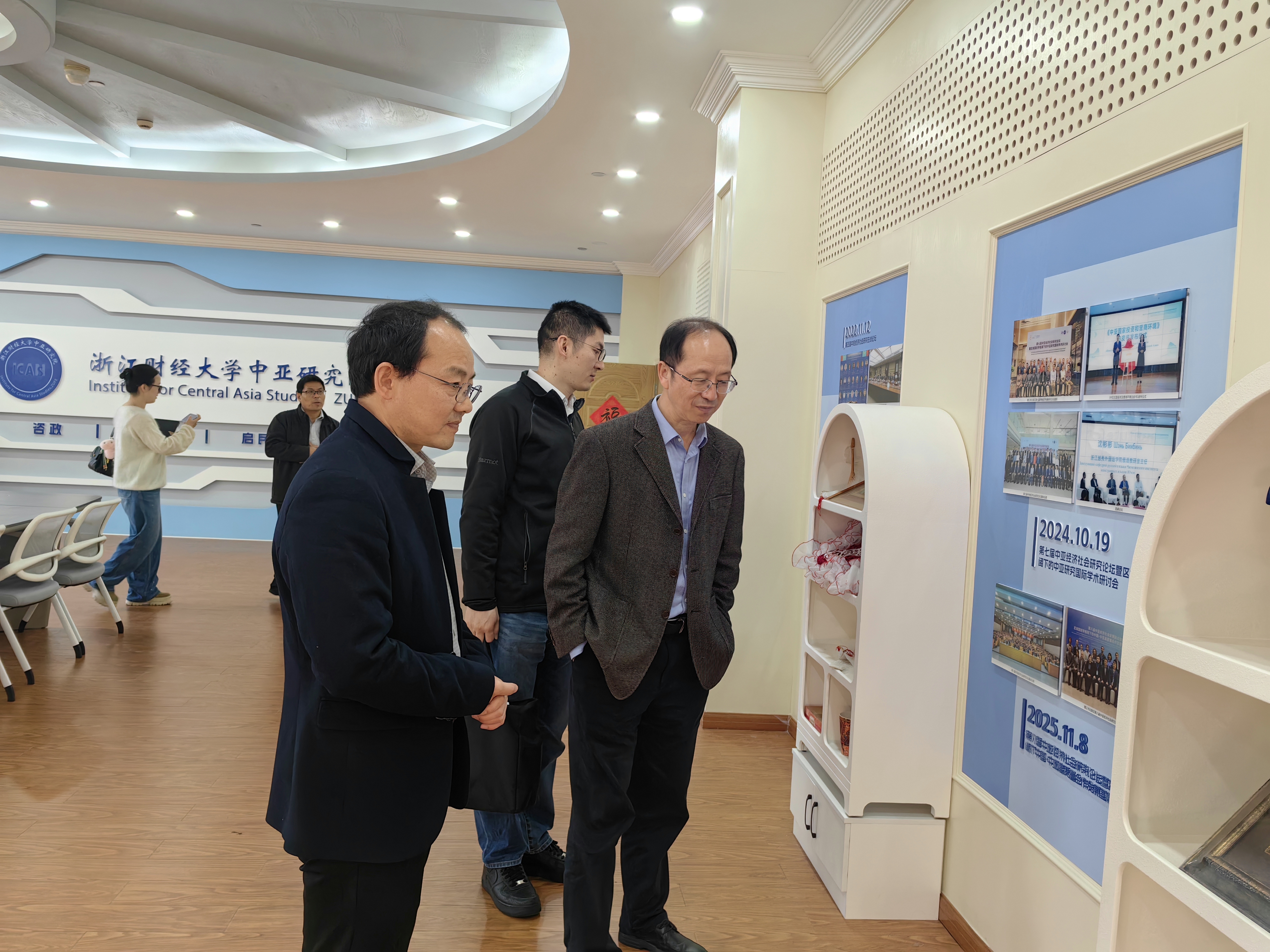 会后,杭实集团一行在院领导陪同下,实地参观了中亚研究院,深入了解我院在中亚经济研究方面的开展情况与阶段性成果。