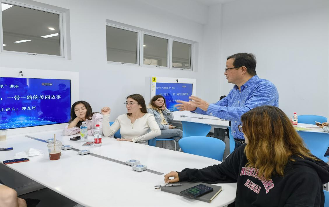 国际学生作题为“浙江外贸:一带一路的美丽故事”的专题讲座。境内相关专业留学生认真聆听了此次讲座。