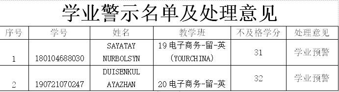 国际学生学籍管理规定》第三十八条规定,学院决定向SAYATAY NURBOLSYN等两名学生提出学业预警。