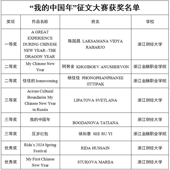 为鼓励来华留学生用立体的影像讲述生动鲜活的中国故事,分享关于浙江经济社会发展、乡村振兴、科技创新、传统文化等方面的见闻与所感;用文字讲述留学生眼中的中国年,我院联合浙江金融职业学院国际交流合作处于2024年寒假期间开展“读懂浙江”国际学生微视频大赛和“我的中国年”征文比赛。